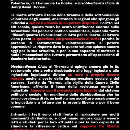 In queste pagine troverai idee incendiarie. Idee sulla libertà, sull'uguaglianza, su come sfidare l'oppressione e l'ingiustizia, anche quando sembrano inevitabili. Il volume su cui stai per mettere le mani raccoglie infatti due dei più importanti scritti sulla libertà e sulla ribellione mai pubblicati, due capolavori che hanno scosso le fondamenta delle società e ispirato generazioni di ribelli e liberi pensatori… ma che prima d’oggi non erano mai stati pubblicati in un unico volume: Discorso sulla Servitù Volontaria di Étienne de La Boétie, e Disobbedienza Civile di Henry David Thoreau.