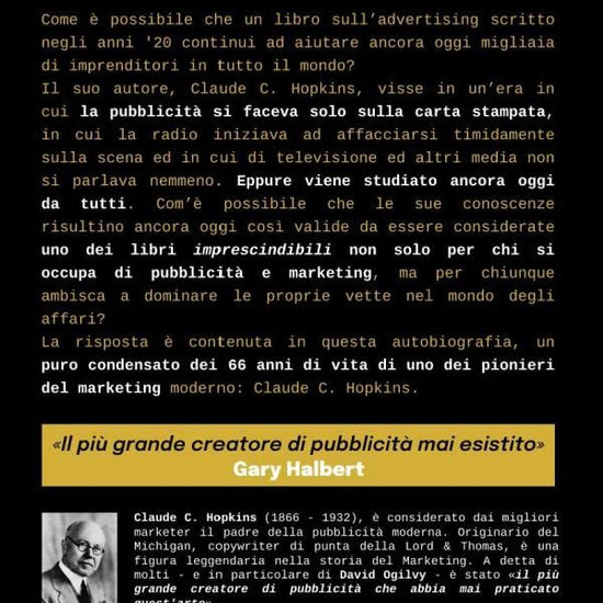 Questa biografia, finalmente disponibile in italiano, è stata il segreto nascosto di moltissimi uomini d'affari e imprenditori statunitensi, a partire dal momento in cui venne pubblicata, ormai quasi un secolo fa. Ogilvy stesso nel suo "On Advertising" ricorda più volte al lettore come egli attinga a piene mani dagli insegnamenti di Hopkins. Gary Halbert lo definisce il più grande creatore di pubblicità mai esistito. Todd Brown e Frank Kern ne parlano nei propri video, e i due mostri sacri Jay Abraham e Dan Kennedy lo citano nei loro materiali ogni volta che è possobile. Insomma, questa è la biografia - fino ad oggi inedita in italiano - del maestro dei maestri del marketing: Claude Hopkins.