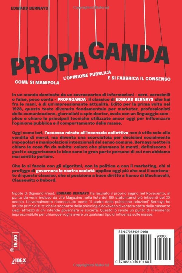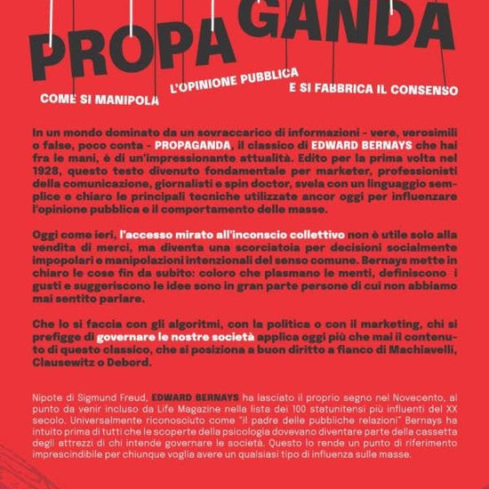 In un mondo dominato da un sovraccarico di informazioni - vere, veritiere o false, poco conta - Propaganda, il classico di Edward Bernays, è di un’attualità disarmante. Edito per la prima volta nel 1928, questo testo divenuto fondamentale per marketer, professionisti della comunicazione, giornalisti e spin doctor, svela con un linguaggio semplice e chiaro le principali tecniche utilizzate ancora oggi per influenzare l'opinione pubblica e il comportamento delle masse.